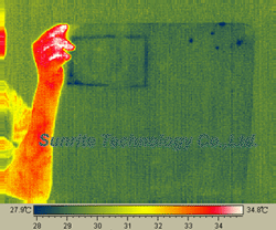 2. 手掌距離物件背後大約5cm,不直接接觸經由空氣當傳導介質 (左圖:可見光; 右圖:紅外線熱像測溫圖)